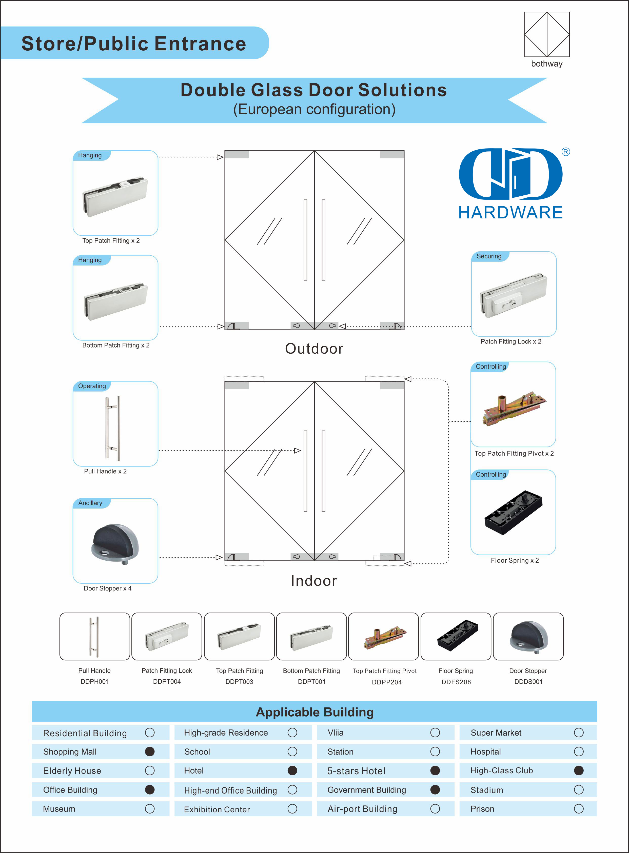 Von D&D wird erwartet, dass es Architekten, Bauherren, Designern und Endbenutzern Türbeschläge zur Verfügung stellt, deren Grundlage auf Sicherheit, Schutz, Funktion und Komfort basiert. D&D-Türbeschläge werden mit dem Ziel hergestellt, die Anforderungen des Gewerbebaus zu erfüllen. D&D Hardware ist in der Lage, umfassende Lösungen für Türbeschläge für Ihre Glas-Doppeltür anzubieten.